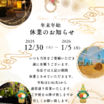 年末年始のお知らせです。誠に勝手ながら、上記期間お休みをいただきます。お休み中にお問い合わせいただいた方には、お休み明け以降順次ご連絡差し上げます。大変ご不便おかけいたしますが、何卒よろしくお願いいた …